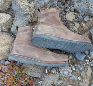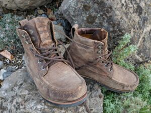 Moccasin toe leather boots are very familiar to me. I grew up on an Iowa farm, and the farmers all wore sturdy leather boots every day. My work boots were standard footwear any time I wasn’t in school. In college, I wore moccasin-toe Wolverines at my part-time job at the Ames, Iowa Hy-Vee grocery store.